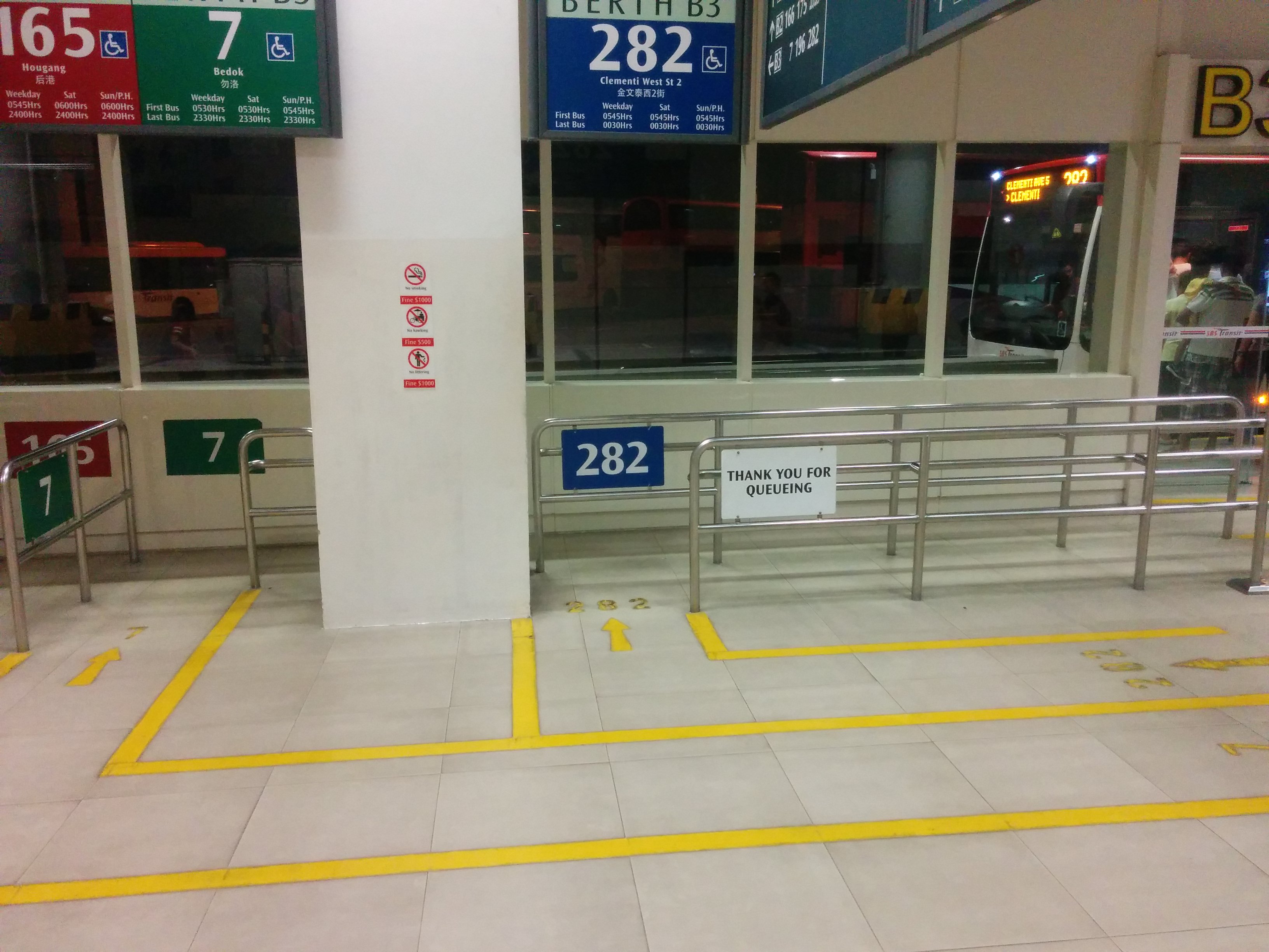 És egy kép a buszmegállóról. Ez egy nagyobb megálló, sok busz jár erre, ennek megfelelően például légkondis. Megvan, hogy melyik kapuhoz melyik buszok állnak, és ha beállt, akkor a fotocellás ajtón át csak belépsz a buszra. Az pedig, hogy a kapunál ne legyen torlódás, sorakozással van megoldva. Én ezen a B3 kapun mentem, a 7-es buszhoz.