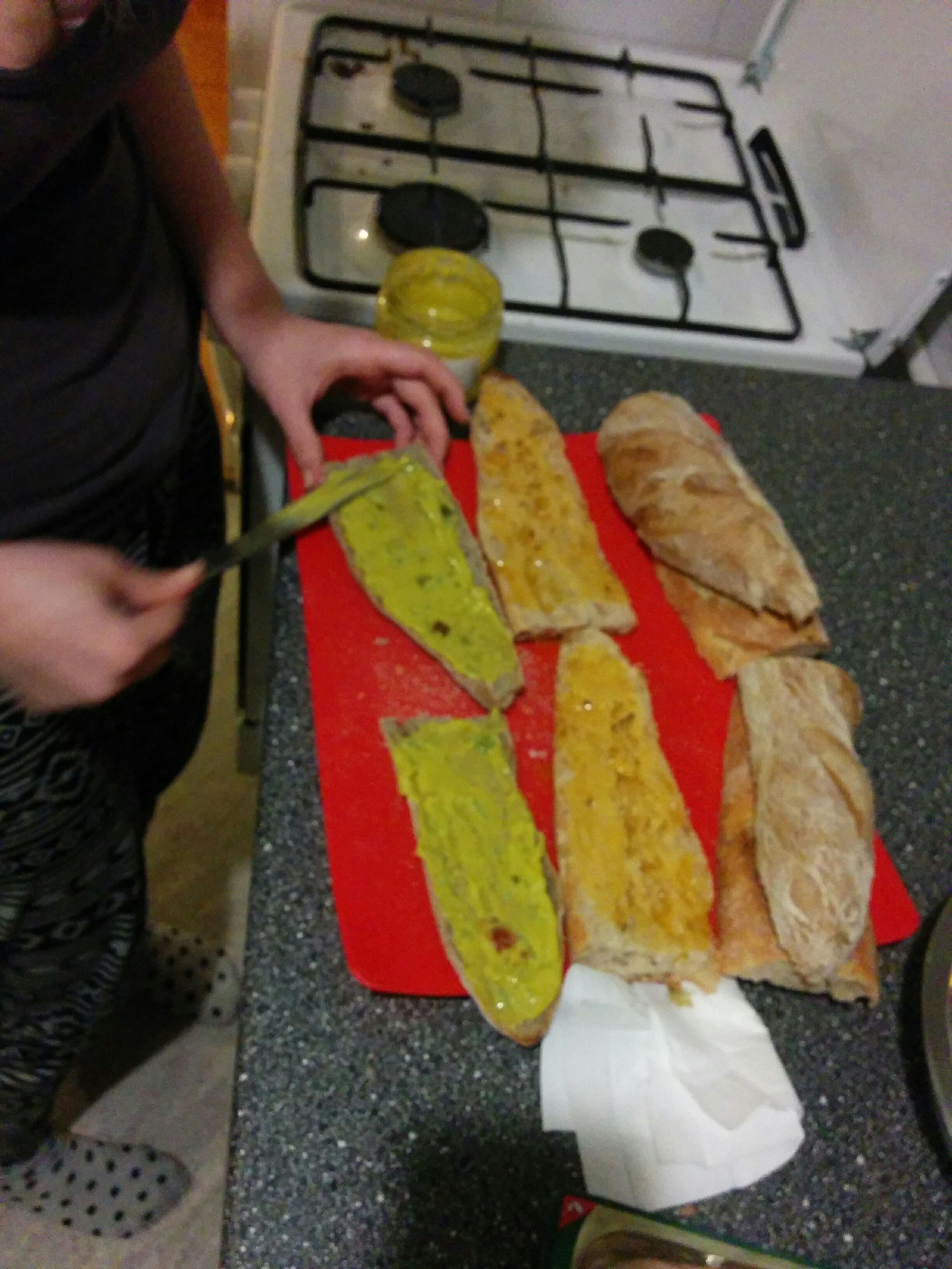 Hogy feldobjuk a szomorú időjárás miatt letört kedélyeket, kenyér helyett rusztikus magvas bagettet és fokhagymás bagettet vettünk.