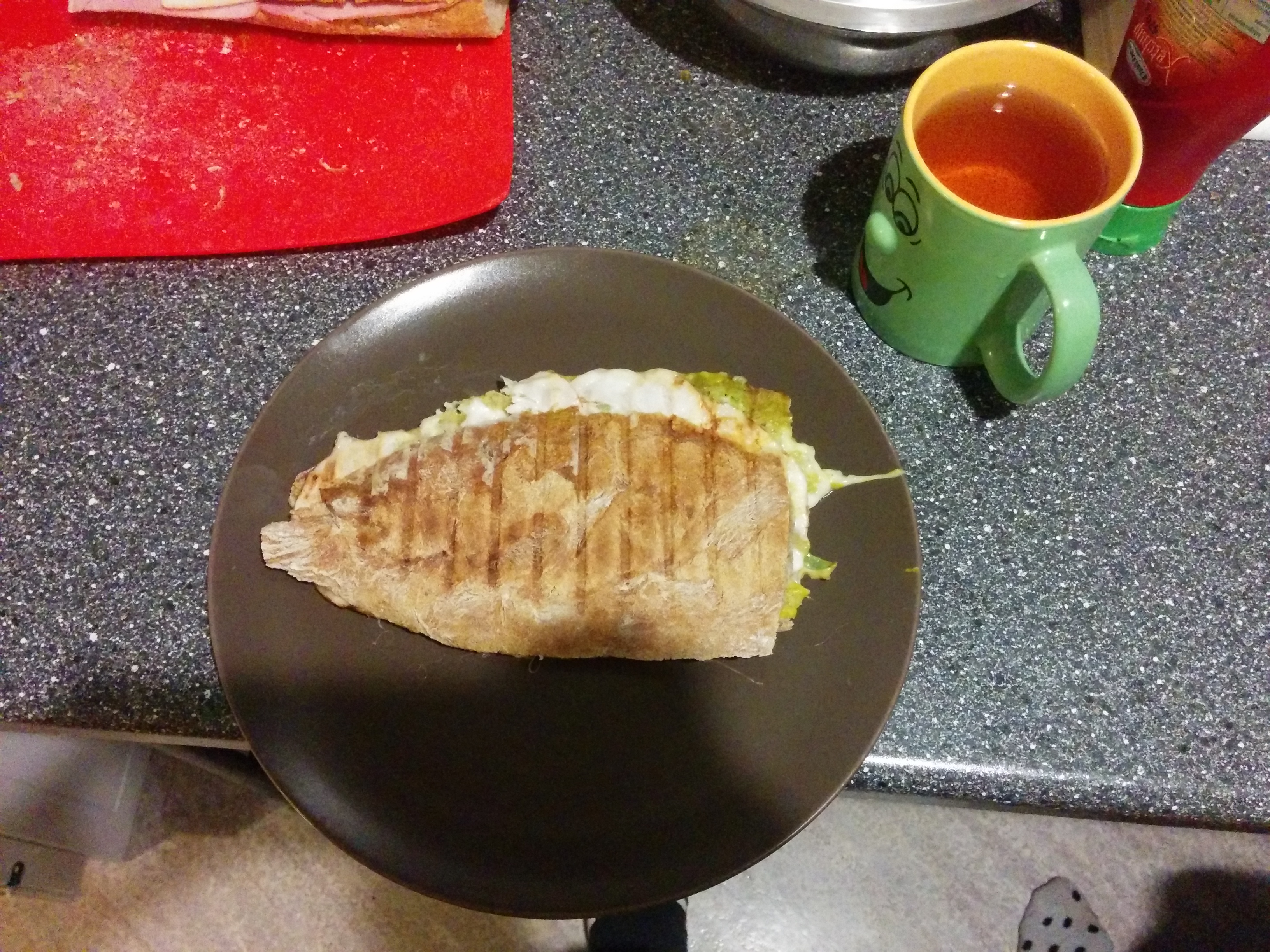 Viszont mikor nagy lelkesen hazaértünk, konstatáltuk, hogy ugyan felvágott meg valami sajt féle van otthon, de vaj az sajnos nincsen. Semmi gond, nem estünk kétségbe, helyette inkább feltaláltuk a jövő melegszendvicsét.