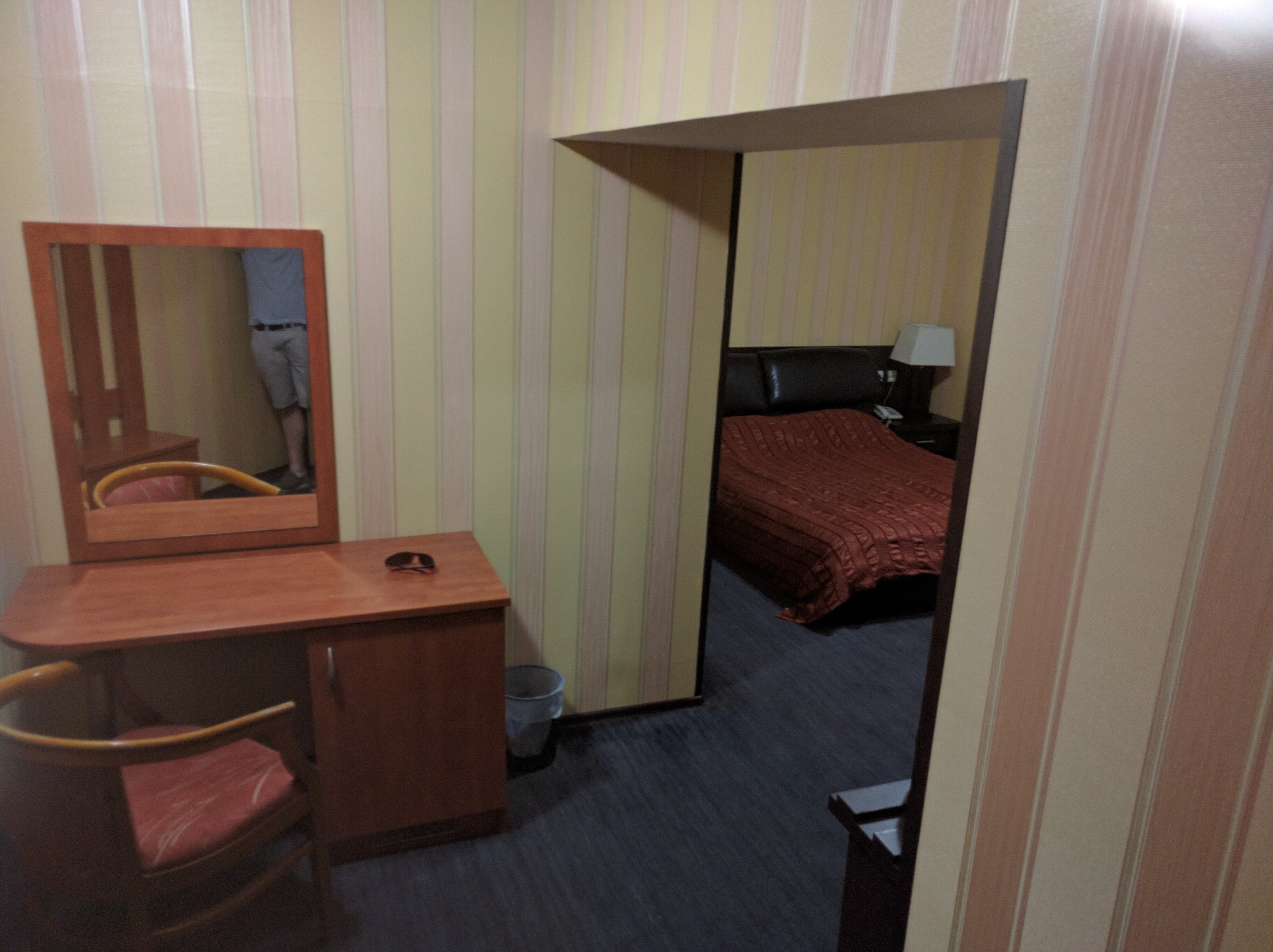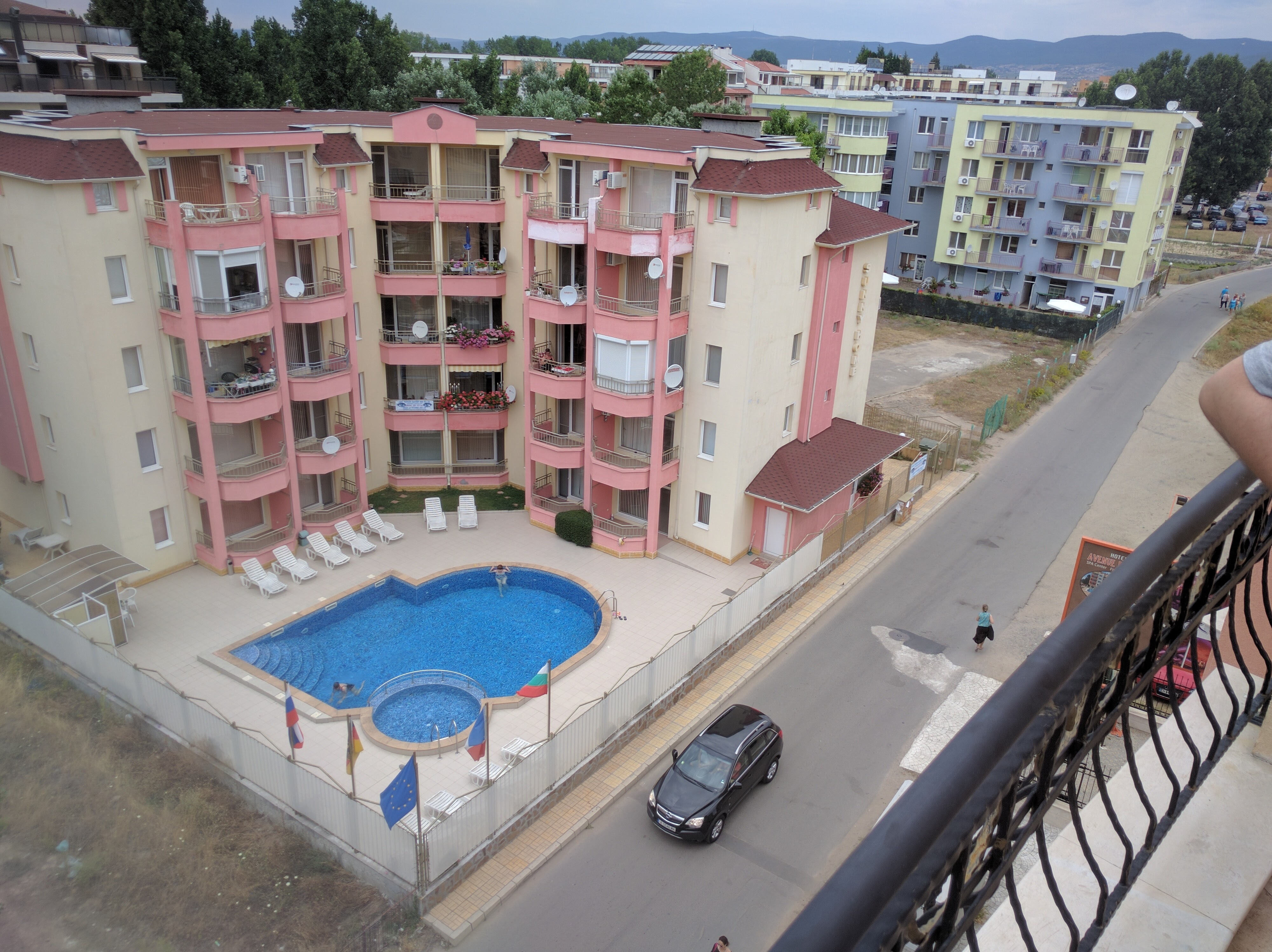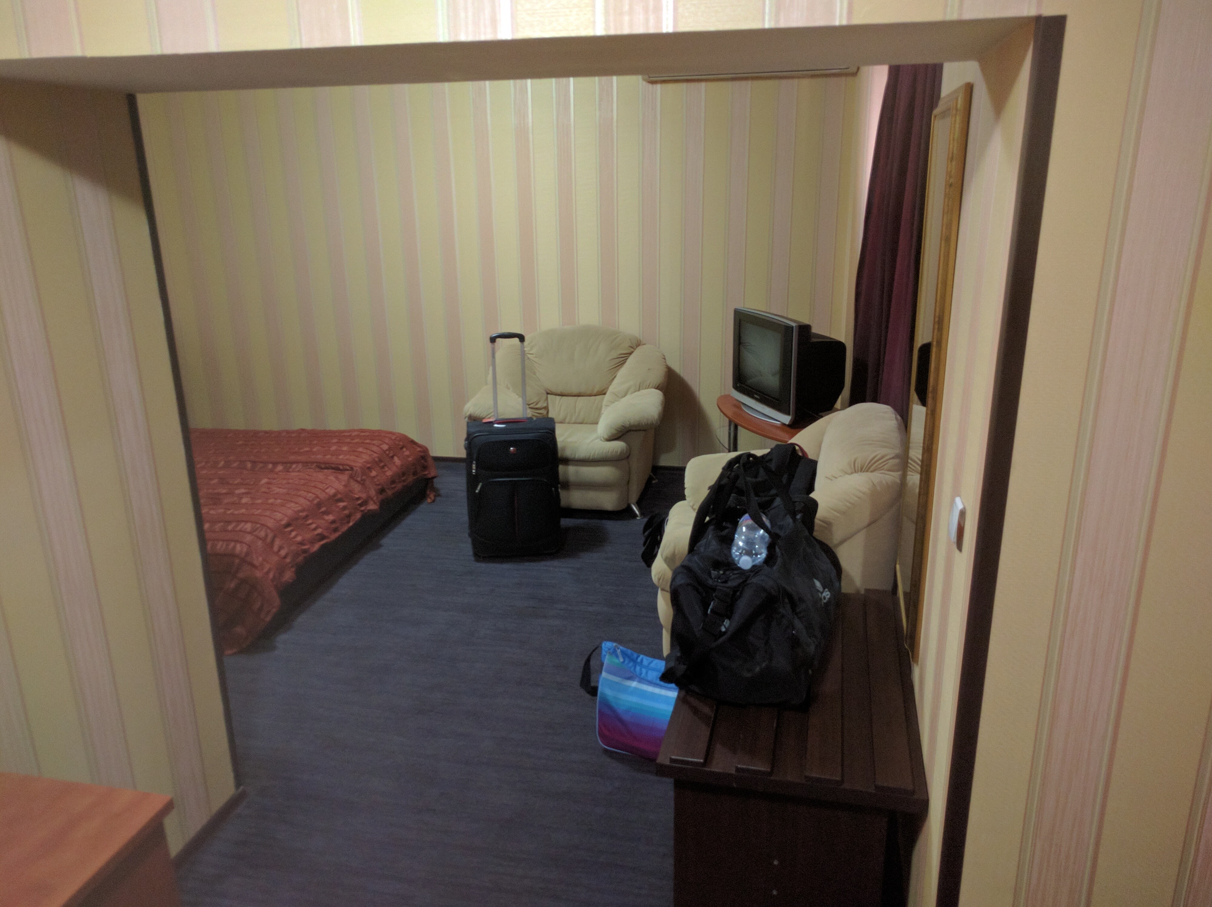 Az építészeti stílus egyébként nagyon hasonlított a fent említett szerbre, de azért az jobb volt. Itt van pár nagyobb épület, de elég ritkán, köztük pedig leginkább semmi, csak gaz, vagy beton. Meg is álltunk a hotel melletti gazban, és bementünk a recepcióra elintézni a dolgokat. Itt is sikerrel jártunk végül, de az angol itt sem volt túl menő. Mondatokat inkább már nem is alkot az ember, csak felsorolja a kulcsszavakat, hátha. Például, mikor Máté megkérdezte, hogy hogy lehet beállni a parkolóba, a “You put the car in.” választ kapta. Vagy, amikor megkérdeztük, hogy esetleg lehetne-e, hogy nem franciaágyas szobákat kapunk, először megörült, hogy “Ok, I understand.”, majd lapozgatott valamit, utana odahívott egy másik csajt, akivel egyeztettek 2 percig, majd újra hozzánk fordult, és megkérdezte: “What’s the problem?”. Egyébként rövid mutogatas sorozat után kiderült, hogy nincs is olyan szobájuk, ami nem franciaágyas. Úgy látszik ebbe az országba csak párosával járnak az emberek. Biztosan nincsenek informatikusaik. A wifi jelszót legalább itt is rögtön sikerült megszerezni. A hotel neve volt az. Deluxe Avenue. Bár azt vettem észre, ezen a környéken minden Deluxe. Lehet ez a városrész neve.