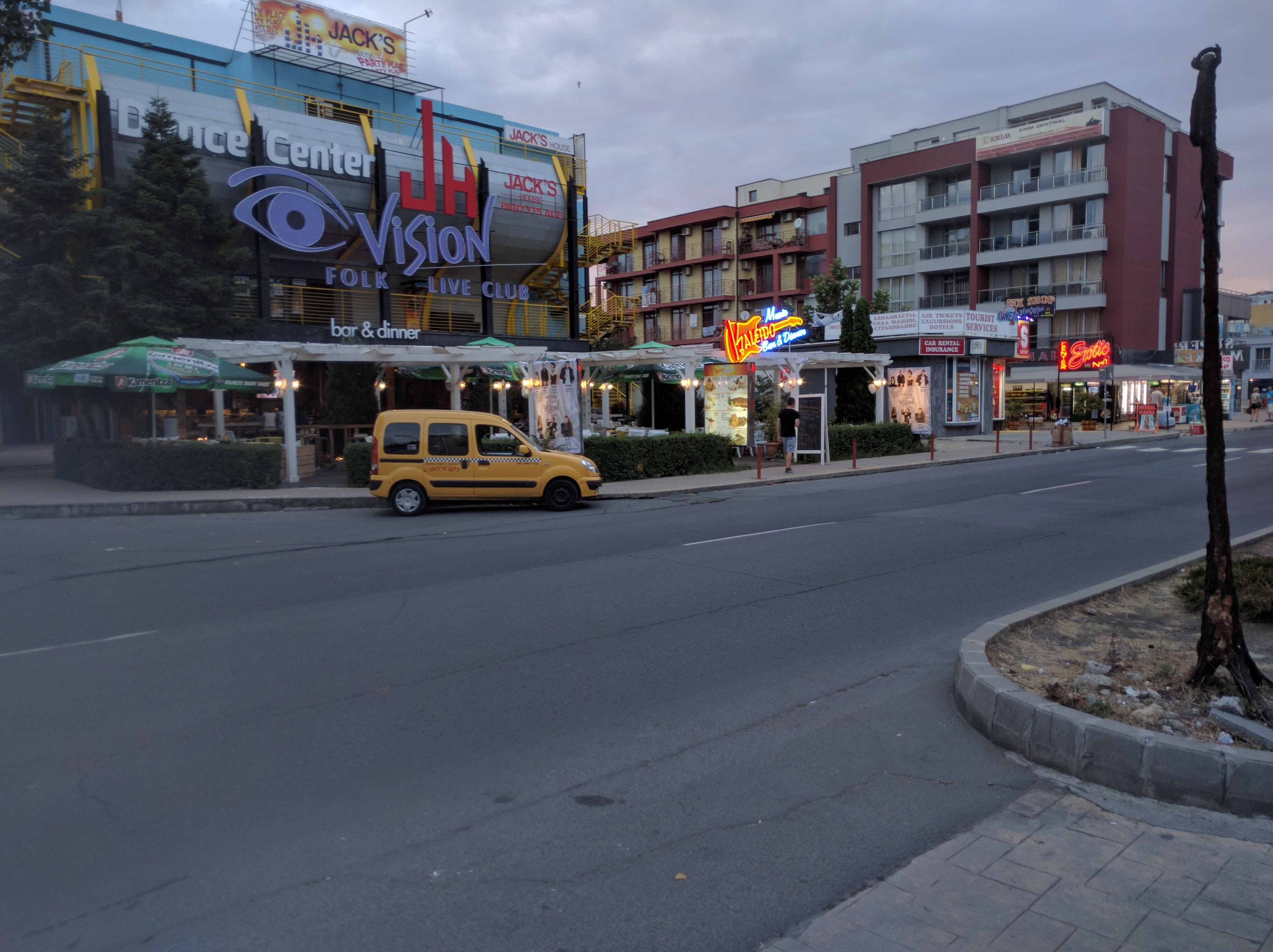 Fürdés után visszajöttünk a szállásra, zuhanyoztunk, majd belevetettük magunkat az éjszakába, kaja és buli után kutatva. Megtaláltuk a helyi Petőfi sétányt, és valóban elég nagy. Félig nyitott helyek, amik se nem kocsmák, se nem éttermek, se nem diszkók, se nem élő zenés helyek, inkább mindből egy kicsi. Voltak emberek is bőven. Aztán kiderült, hogy a tömeg több, mint fele igazából ott dolgozó. Nem tudtunk megtenni 3 métert a nélkül, hogy ne szólítanának le, hogy felajánljanak néhány ingyen sört 15 levás belépő után, vagy 7-et fizet 10-et kap sörakciókat hajnal 2 és fél 3 között, esetleg ingyenes alkohol fogyasztást egy órán át a belépőért cserébe, persze, ha addig sorra kerülsz a pultnál. Szóval mindenki azt akarta, hogy menjünk hozzájuk, a világ legjobb helyére. Annyira idegesített ez a folyamatos, mérhetetlen, sablonos seggnyalás, hogy 5 perc séta után legszívesebben hazajöttem volna. Nem lehetett úgy megmozdulni, hogy valaki ne cuppanna rá az emberre. És ha beszélsz velük, rögtön jönnek a kérdések, honnan jöttél, óó hungari, budapest, áj bín der, ríli nájsz, gúd futball, dzsudzsák dö beszt.