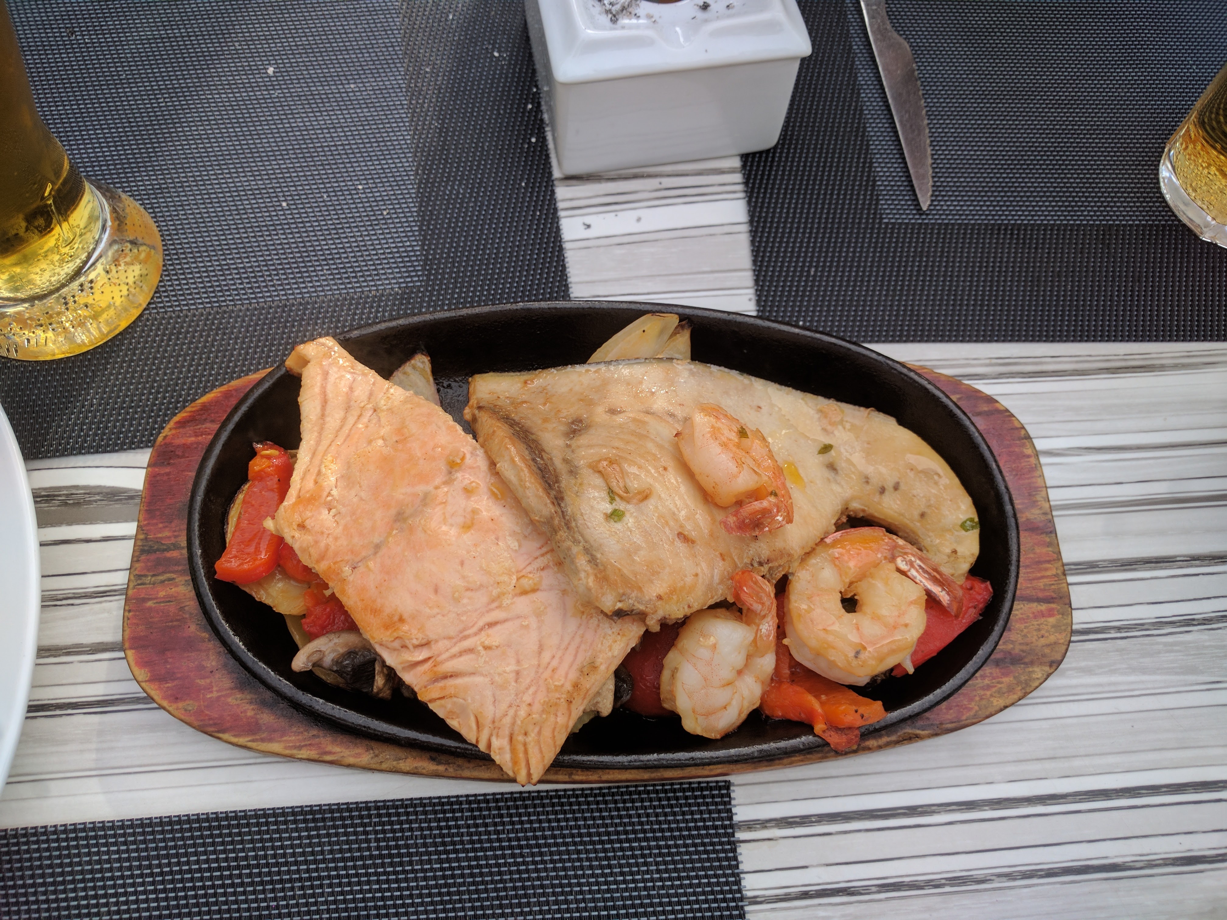 Ezek után lemásztunk a hegyről, hogy valami elemózsia után nézzünk, és végül be is tértünk a magyar csaj éttermébe. Kértünk ehető kaját, amivel végre jóllakunk a tangeri éhezés után, és egy halas tálat, ami király is. Igazából minden király volt, hatalmas adagokat kaptunk, a kis kardhalakat meg prawn-okat alig tudtuk lenyomni. De tök érdekes egyébként, az a tapasztalatom eddig a kajákkal a nyaraláson, hogy itt minden finom, amit otthon nem szeretek. Lehet a fagyasztó ízű mirelit garnéla az aldiban, a savanyú narancs a spárban, vagy a két féle oliva bármelyike a boltok polcán nem pont ugyan azt a frissességet és minőséget képviseli a vadkeleten, mint itt. De ezen felül is állítom, hogy a később kóstolt paprikás csirke, marhapörkölt, vagy brassói is simán van olyan jó, mint otthon, csak itt más a neve.