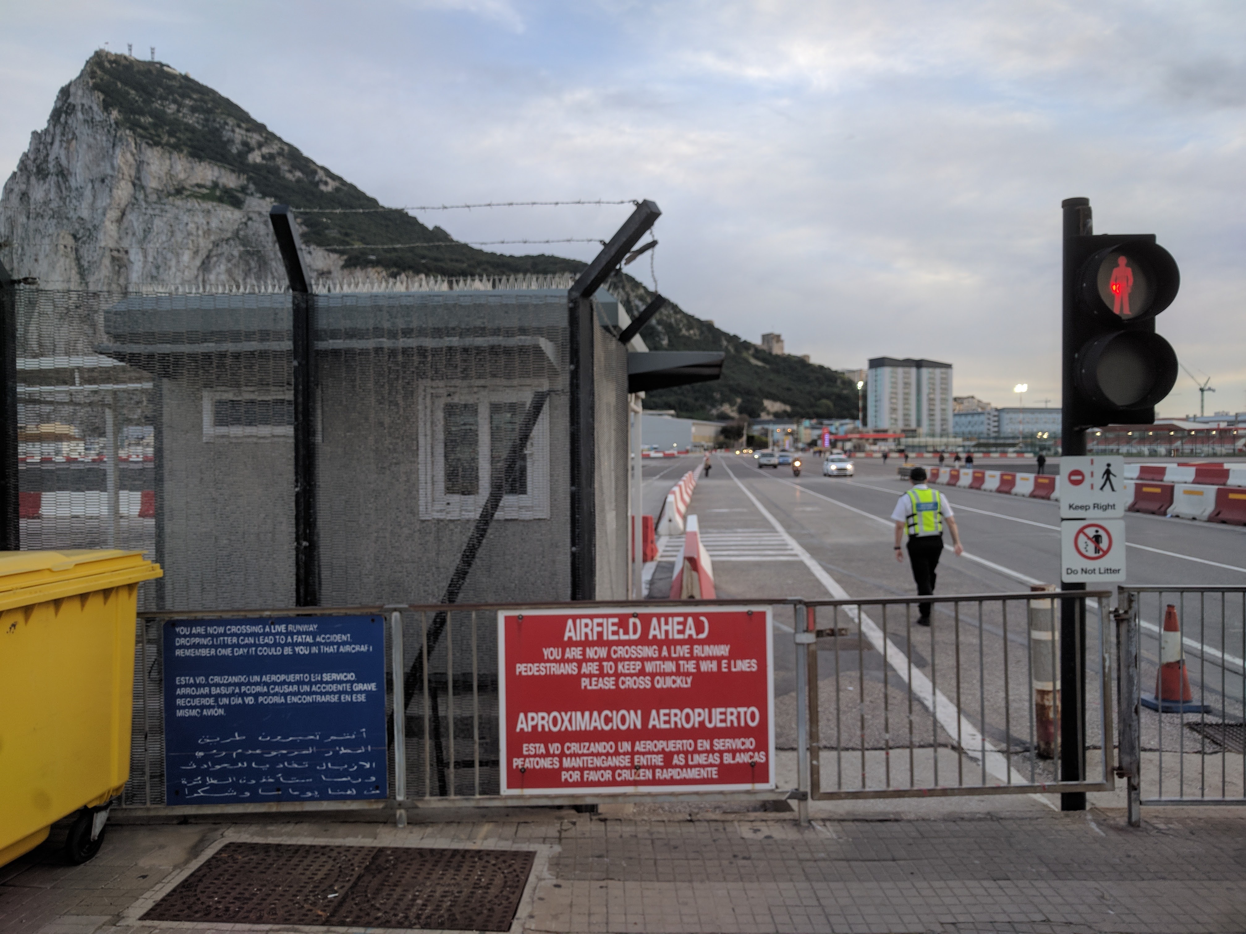Amint átértünk, rögtön a repülőtér fogadott. Aki nem tudja, a határ mentén nemrég felhúztak egy repteret, ami a helyhiány miatt nyilván egészen rövid, tipikusan akkora, mint amit a légikatasztrófák című műsorokban látni. Nem is száll itt le sok gép, csak Londonból, meg talán Sevillából járnak fapadosok, meg persze a készenléti vadászgép. Aminek mondjuk nem teljesen értem a létjogosultságát, kicsit nehéz elképzelni, ahogy egy azonosítatlan légi jármű megsérti Gibraltár légterét, majd gyorsan felküldik a MIG-et, vagy mi lehet, hogy kísérje ki, de ők tudják. Szóval, aki elnéz a lefejezett, átlőtt zöld gyalogos lámpa, és a jó brit Keep Left felirat mellett, ezt a kifutót látja. És igen, a lámpa itt a zebrán való átkelés lehetőségét jelzi, és nem, nem az autók haladnak keresztben, hanem a repülők. Szóval elég vagány. És azt hiszem ez a leghosszabb zebra is, amin valaha átmentem. A kifutó mellett egyébként közvetlenül a városi futball stadion található. Elég szokatlan kombináció 🙂