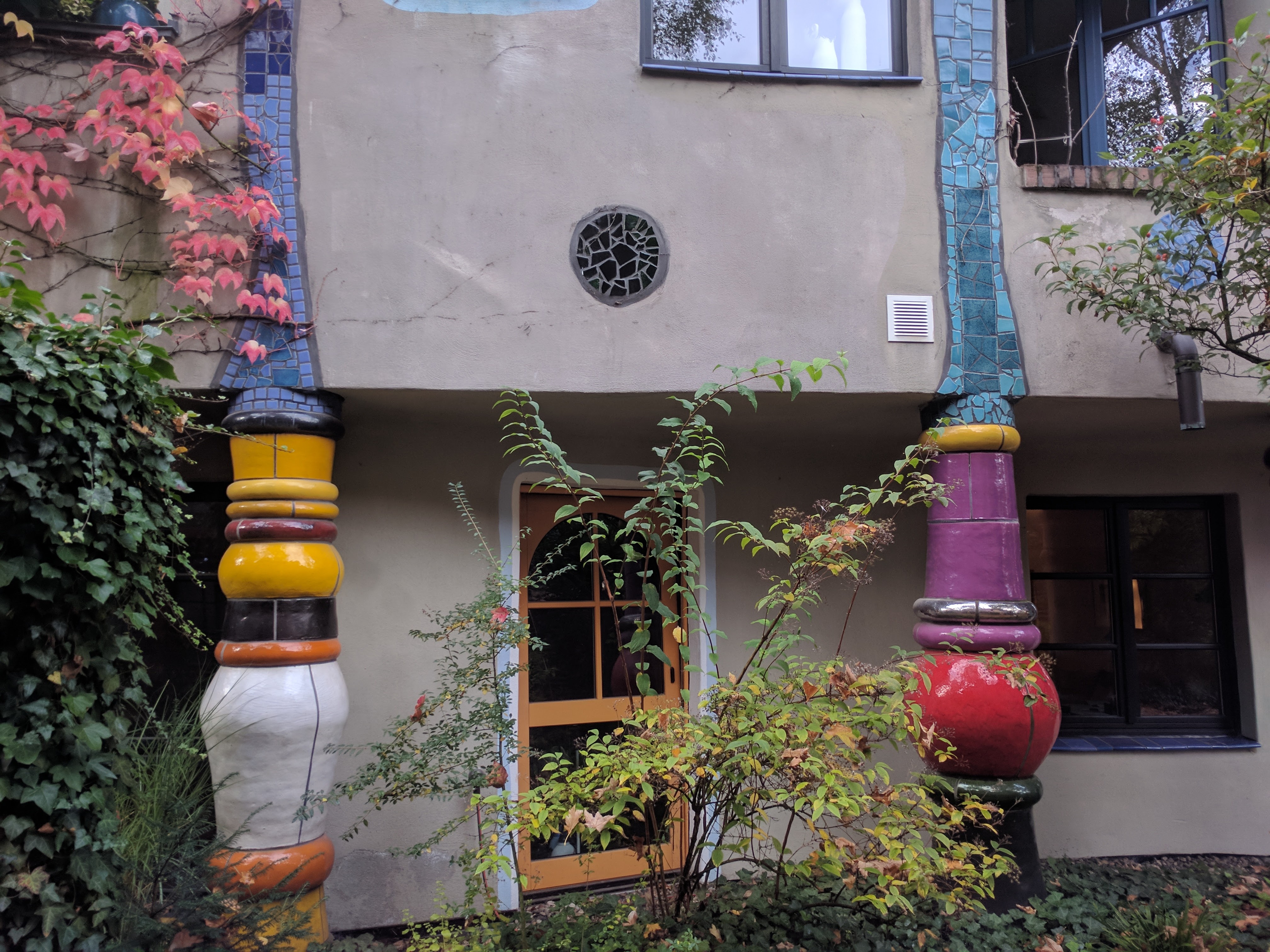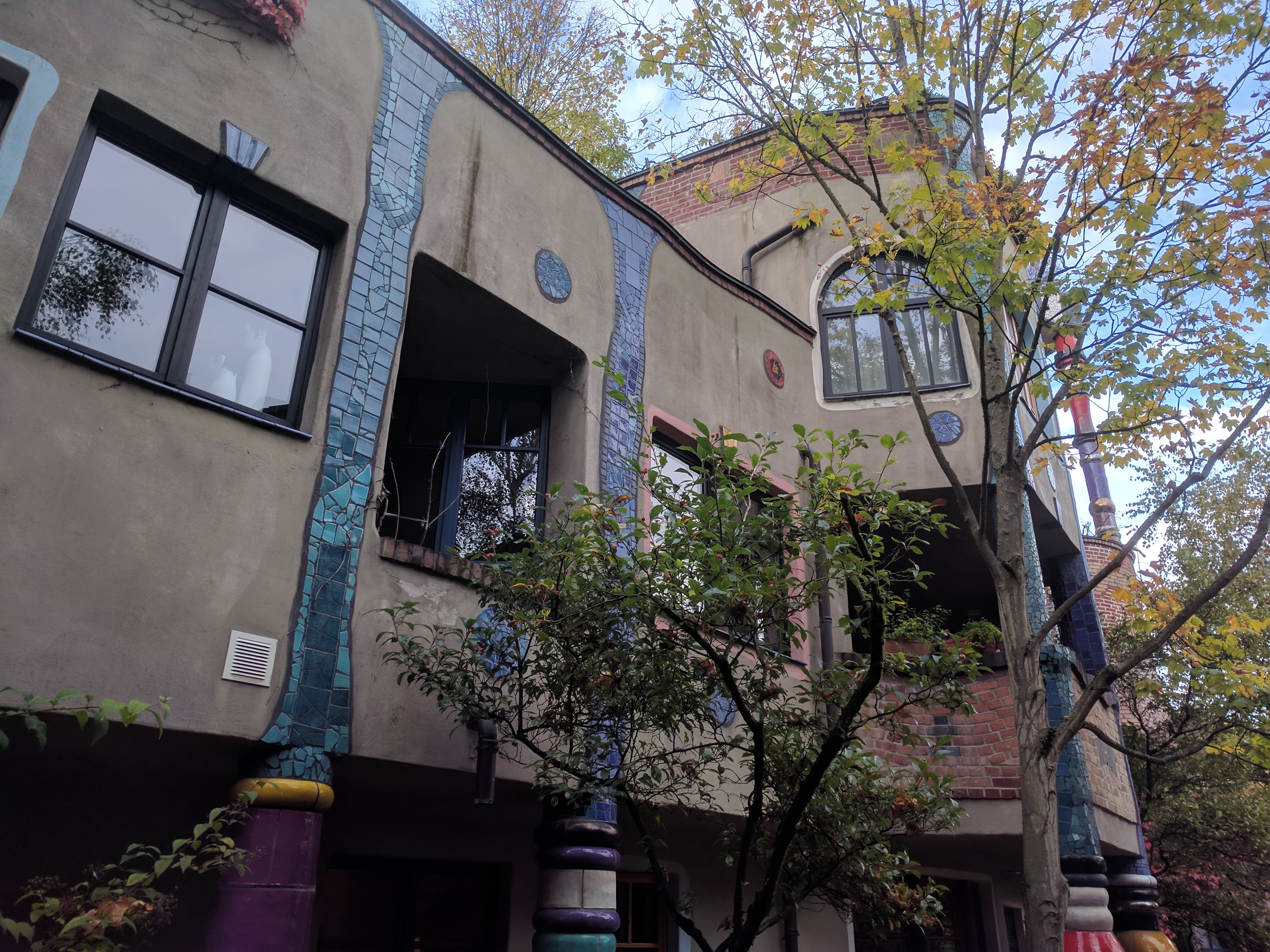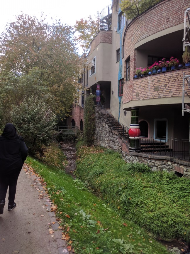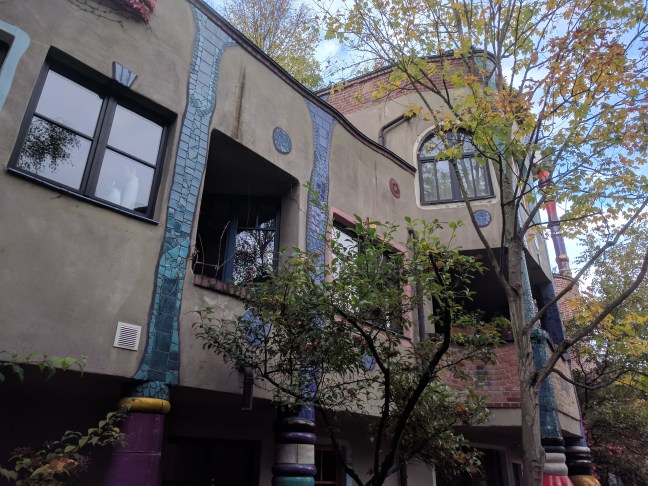 Van a szomszédjában egy nagyon menő épület, egy Hundertwasser ház. A faszi, aki nem ismerné (én nem ismertem) egy híres építész volt, különlegessége pedig, hogy be volt oltva az egyenes vonalak és szimmetrikus dolgok ellen. Én, mint enyhe OCD-ben szenvedő informatikus, aki hatalmas fanja az egyenes vonalaknak, és a szimmetriának úgy amblokk, nem gondoltam volna, hogy tetszeni fog, viszont kívülről tényleg nagyon jól néz ki.