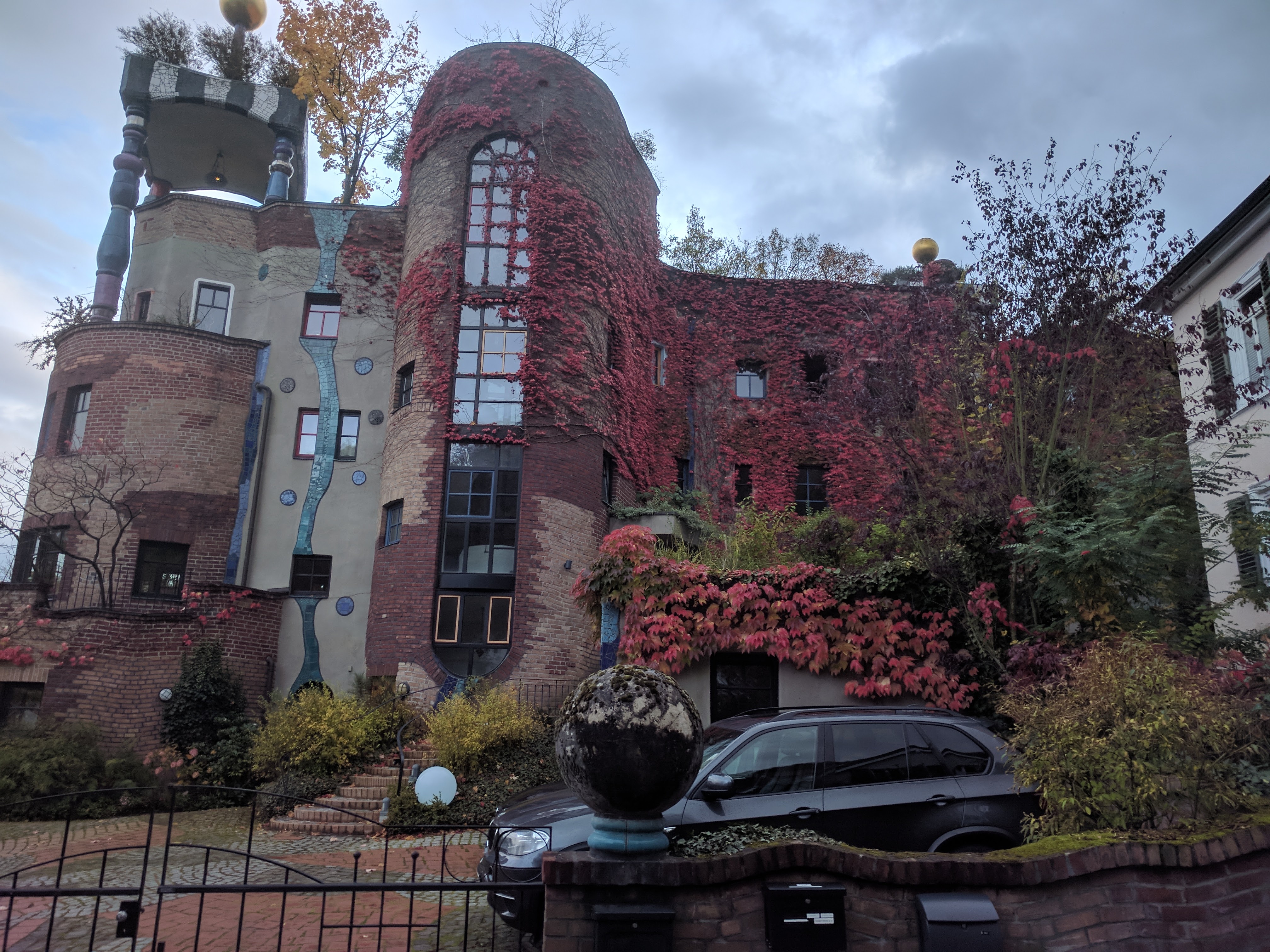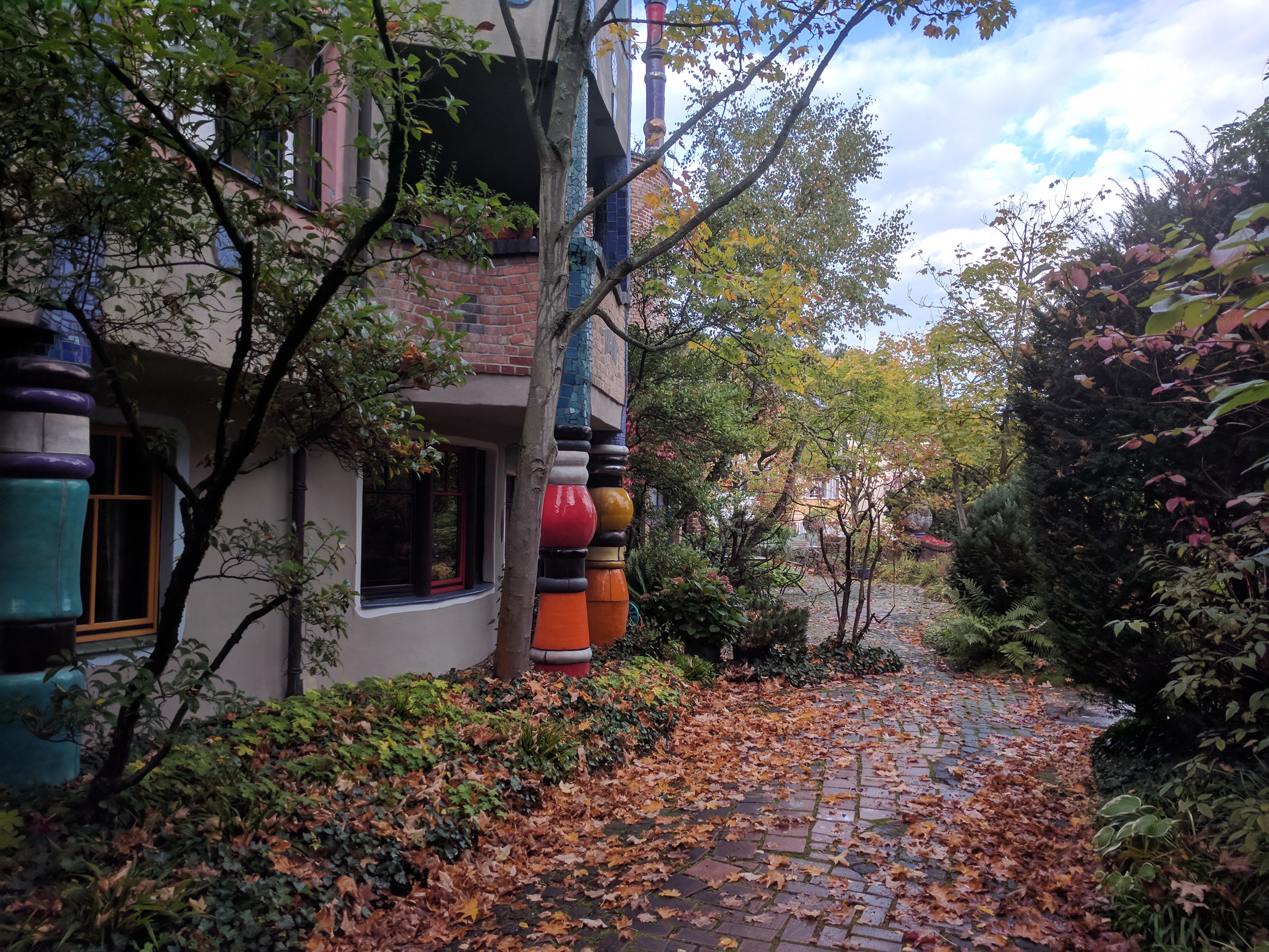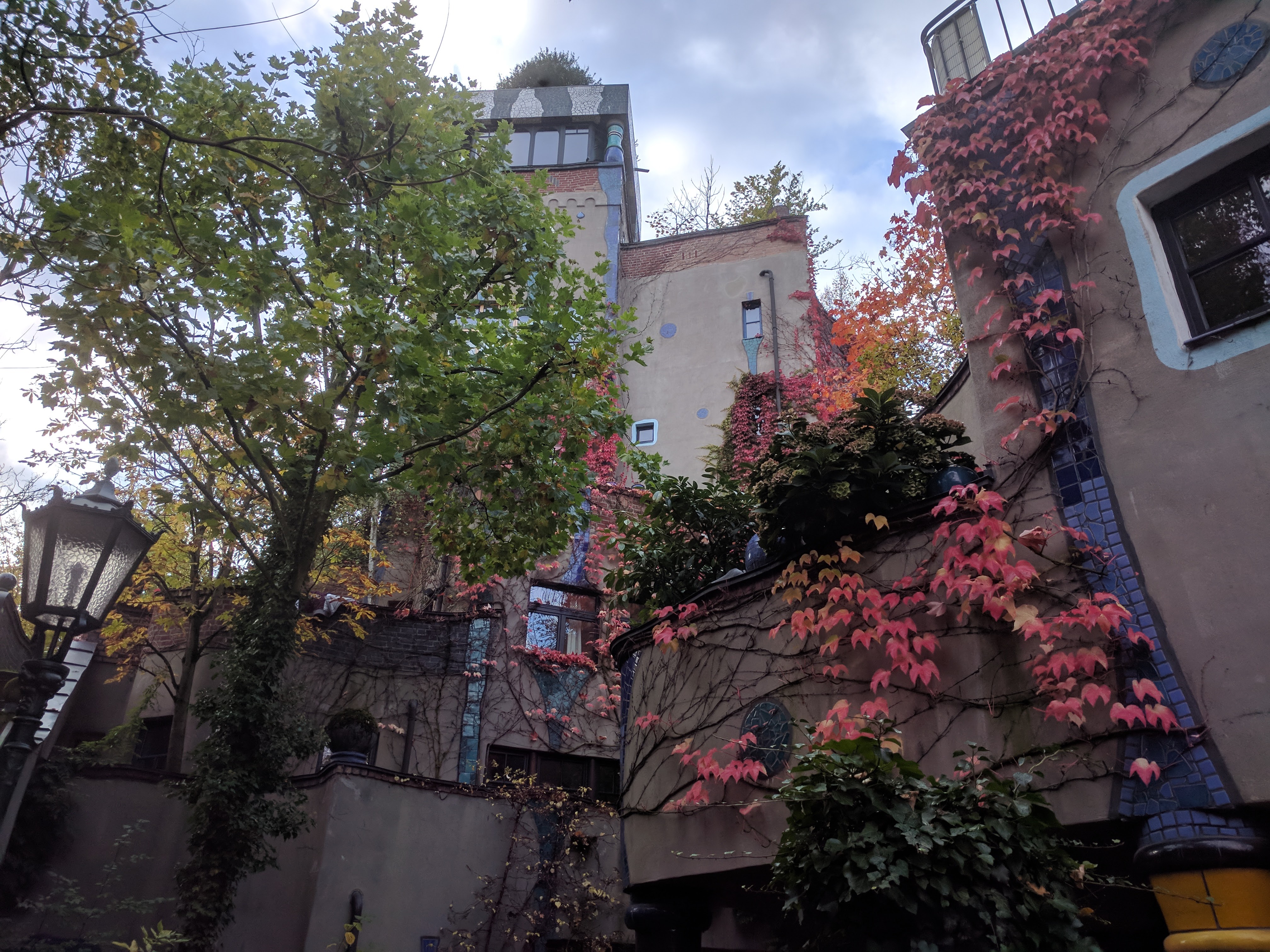 Van a szomszédjában egy nagyon menő épület, egy Hundertwasser ház. A faszi, aki nem ismerné (én nem ismertem) egy híres építész volt, különlegessége pedig, hogy be volt oltva az egyenes vonalak és szimmetrikus dolgok ellen. Én, mint enyhe OCD-ben szenvedő informatikus, aki hatalmas fanja az egyenes vonalaknak, és a szimmetriának úgy amblokk, nem gondoltam volna, hogy tetszeni fog, viszont kívülről tényleg nagyon jól néz ki.