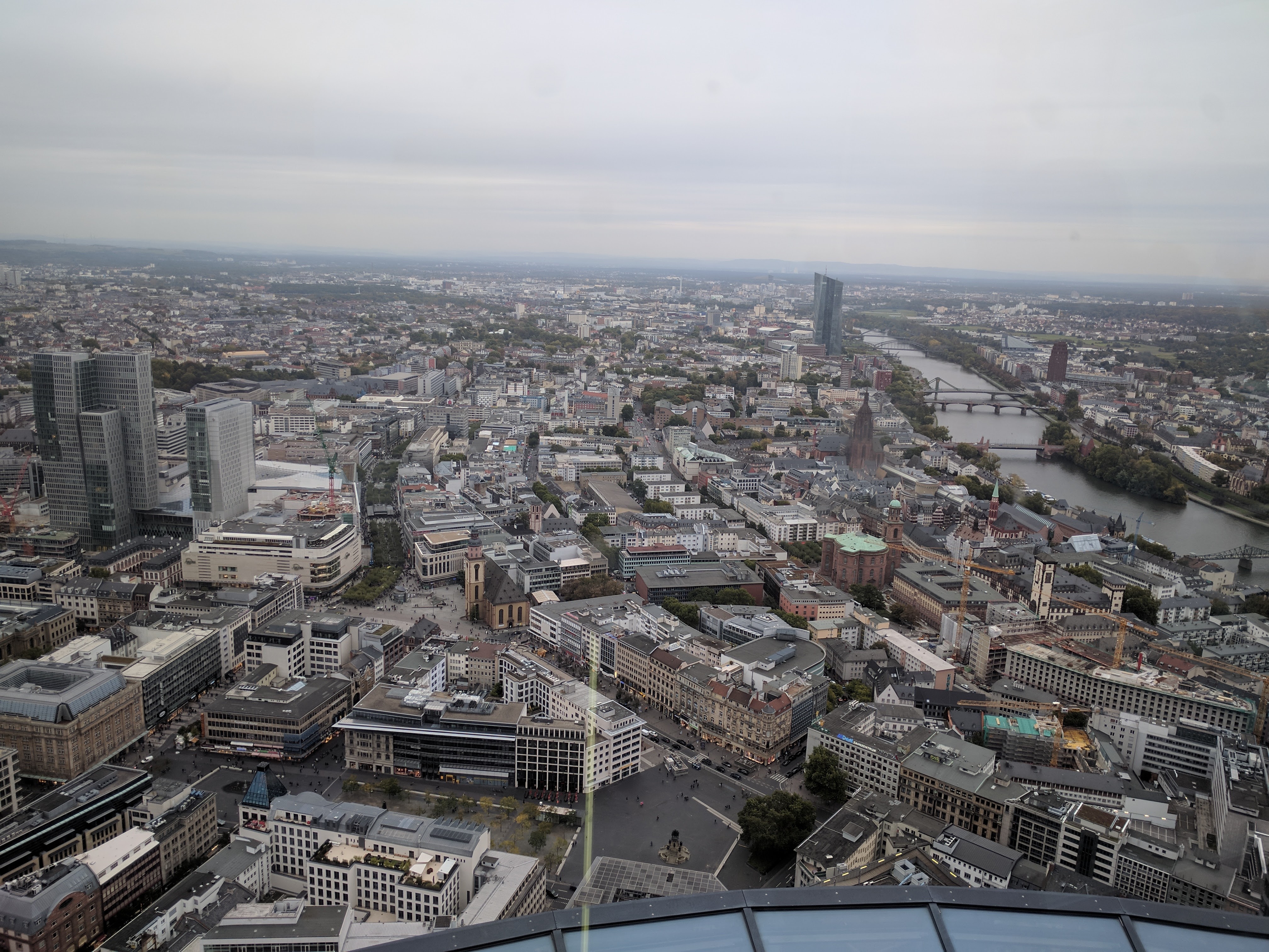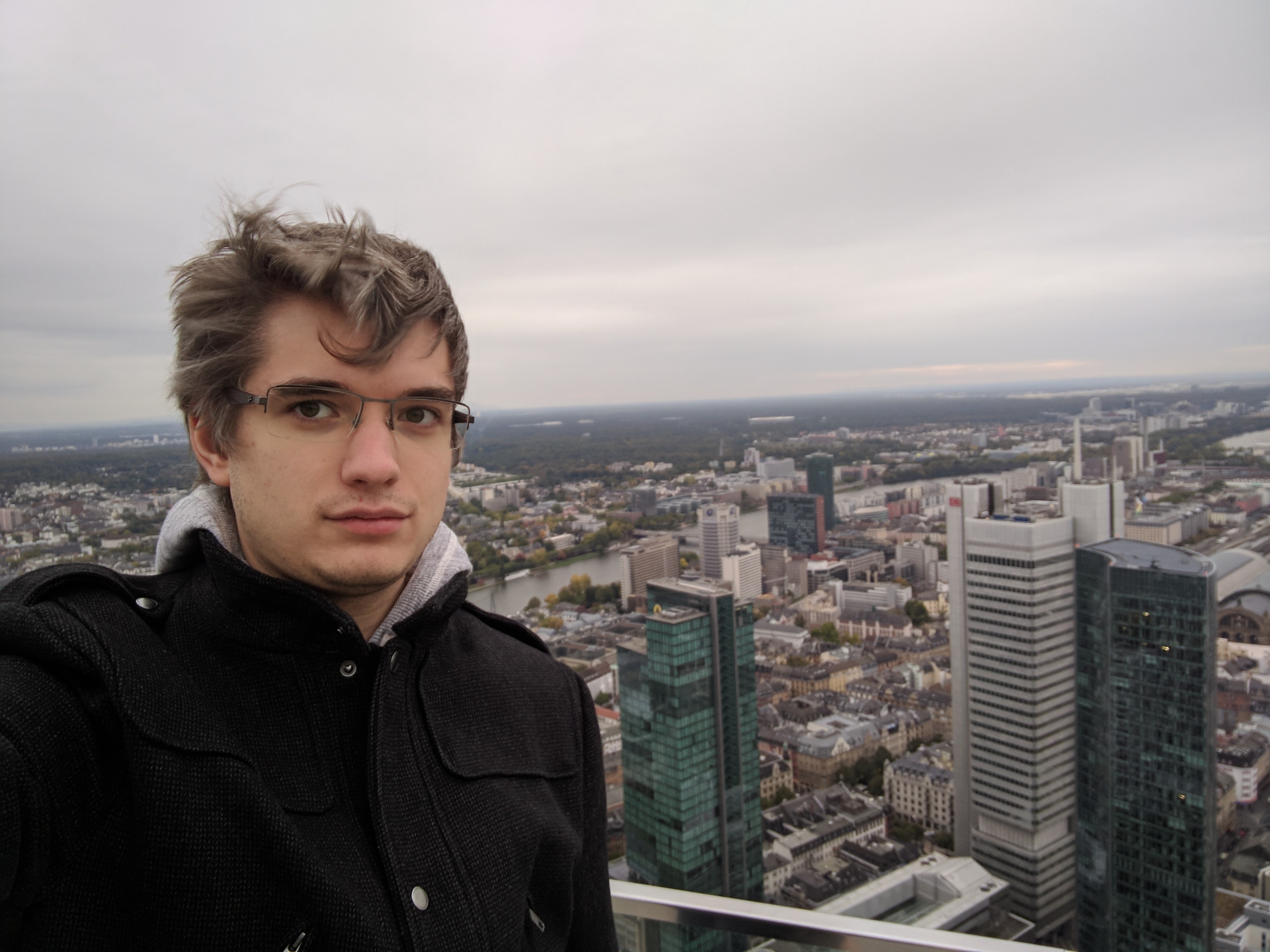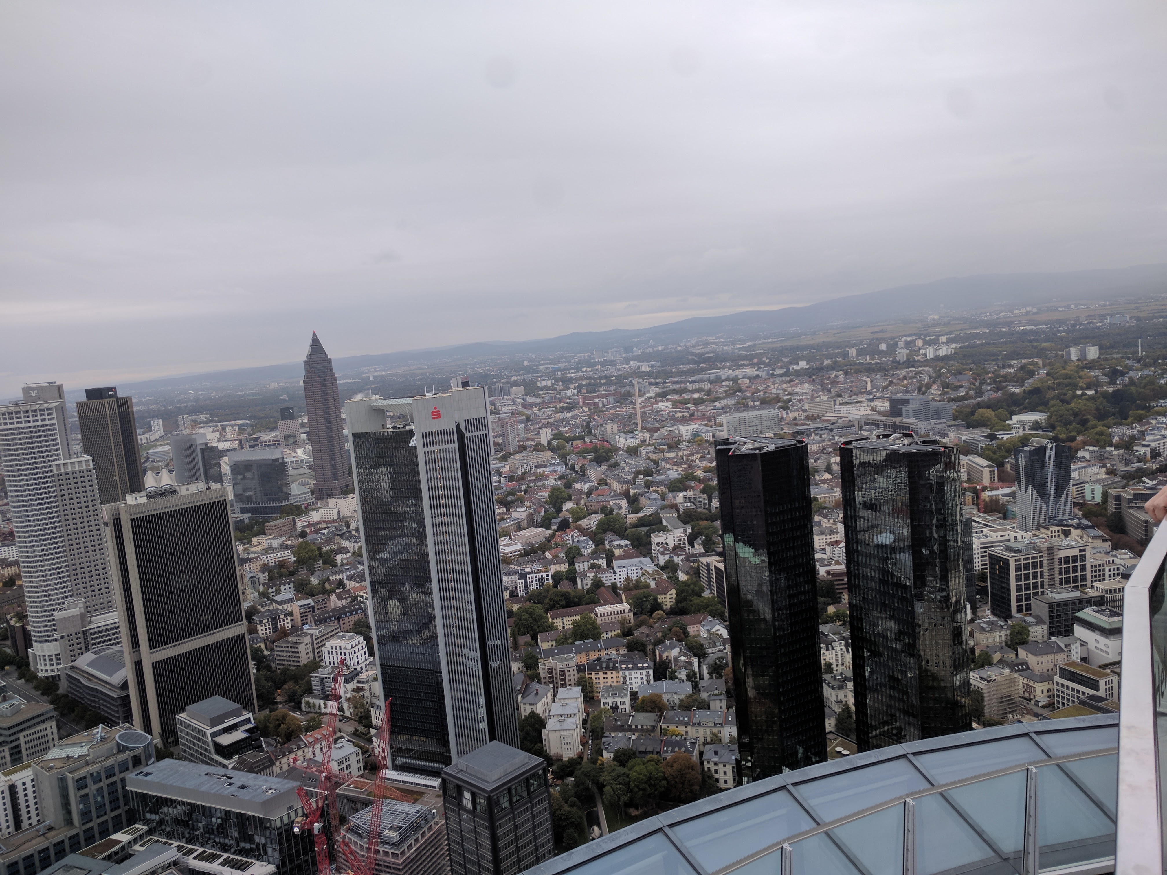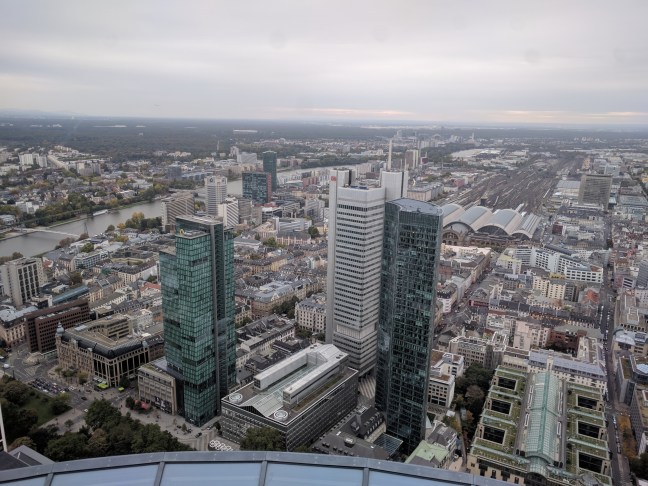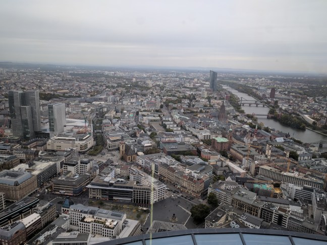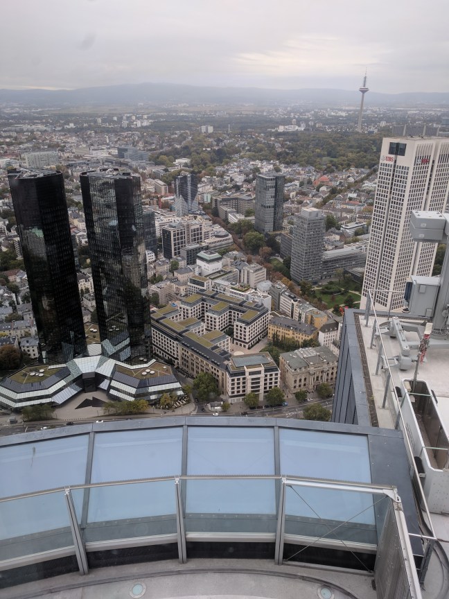 A toronyba diák jegyet vettem, pedig nem szeretek csalni. Valahogy itt mindig hülyének néznek, ha nem diákot akarok venni, mert úgysem ellenörzi soha senki. Az is 5 euró volt. A bejutás olyan volt, mint a reptéren. Az épület maga 56 emeletes, és nem lehetett gyalog menni, csak lifttel. Viszont egész menő, van rajta kilóméter óra, olyan 20-al száguldottunk felfelé. A Schönherz turbólift elbújhat mellette, itt aztán rendesen bedugul az ember füle. Amúgy csak a 4. legmagasabb épület frankfurtban. Ha valaki kíváncsi volna, Németország 15 legmagasabb épületéből 14 Frankfrutban van, így azért nem nehéz. (A 9. asszem a posta torony Bonn-ban)