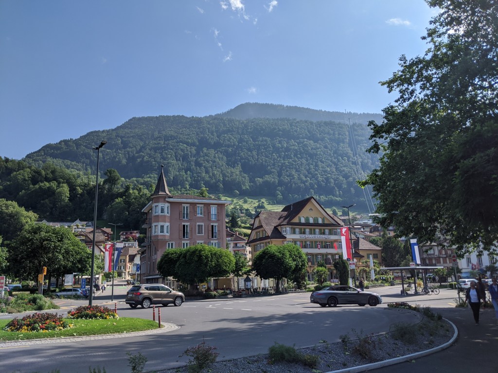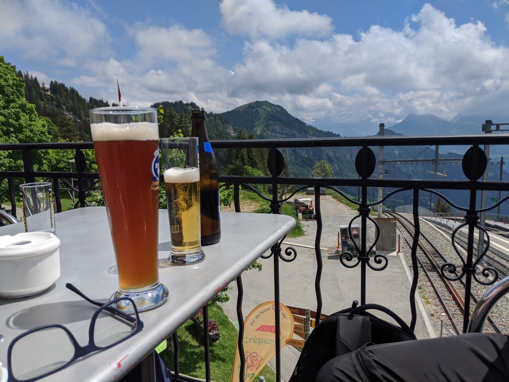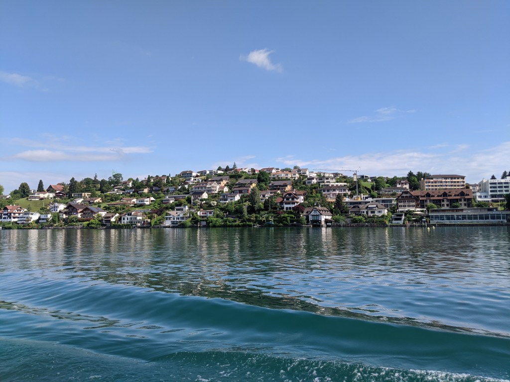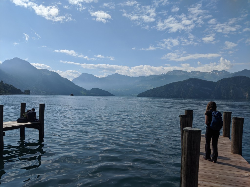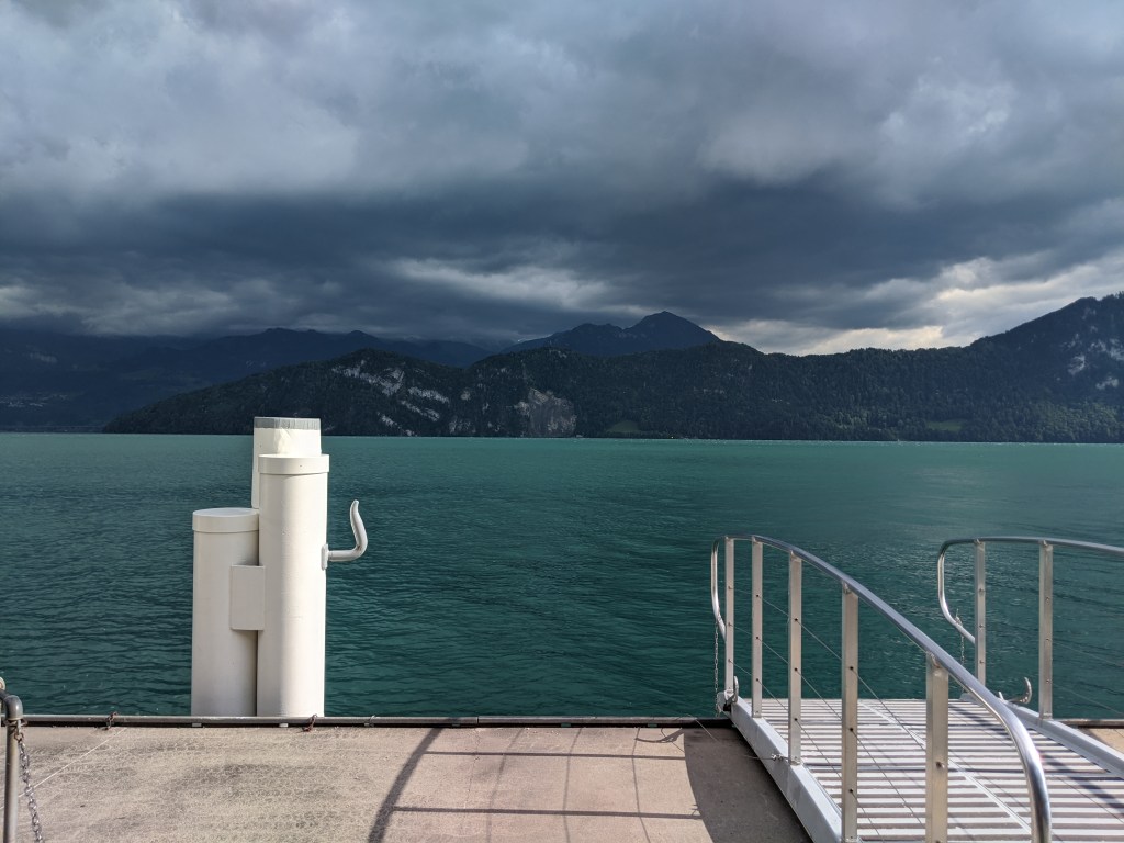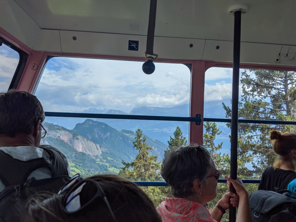 Lefelé Viktor mindenképpen vonattal akart menni, mivel nem barátja a libegőknek, de sajnos nem értette, amit a jegypénztáros mondott neki svájciul, így mindenkinek vett egy libegő jegyet lefelé. Én nagyon élveztem – ő kevésbé, de azt mondta végül, hogy nem is volt olyan vészes. A hajót visszafelé épp lekéstük, így leültünk a parton meginni egy sört.