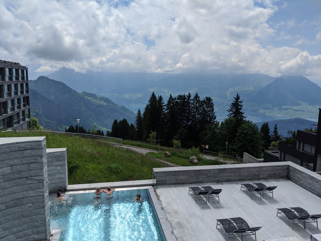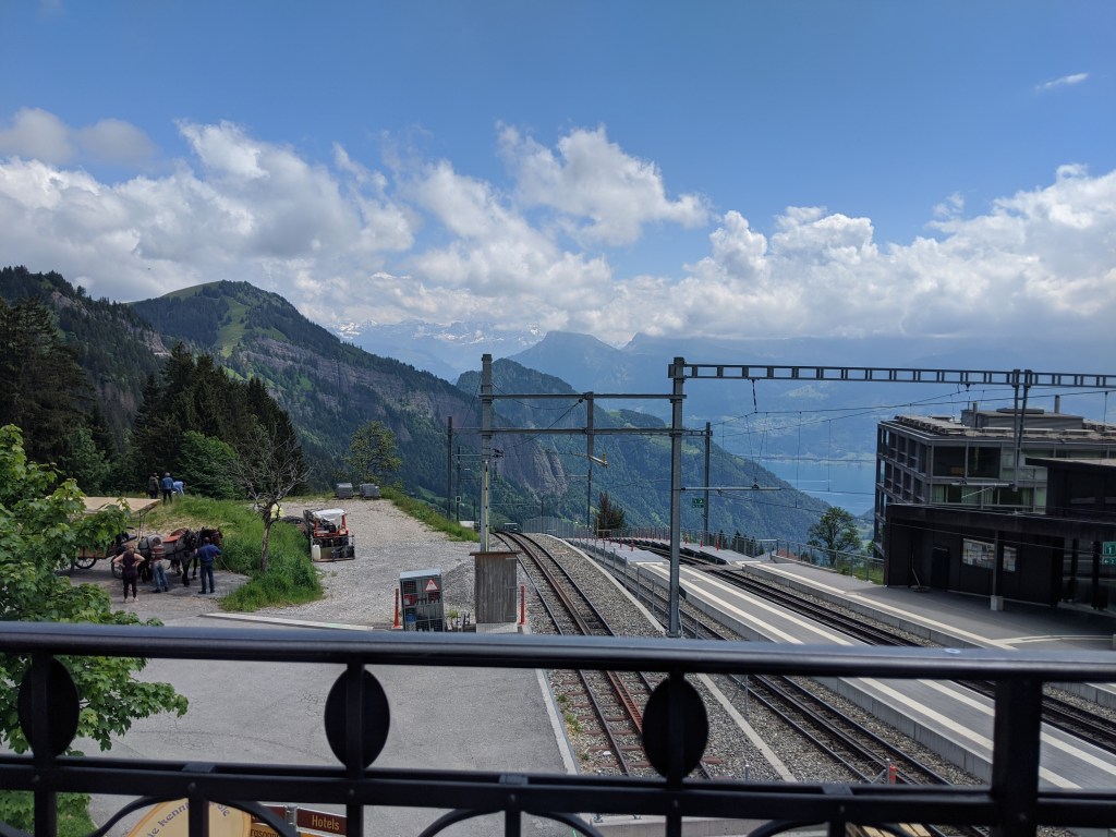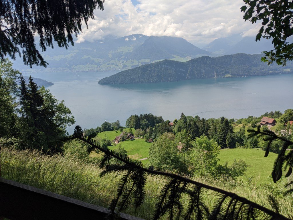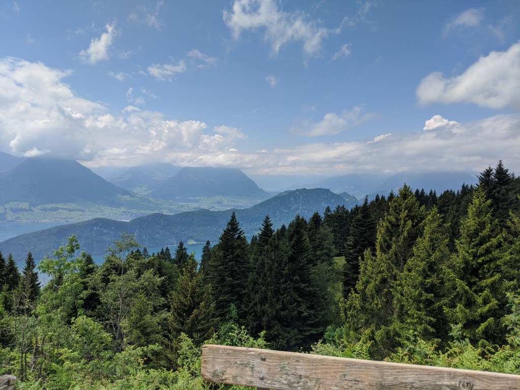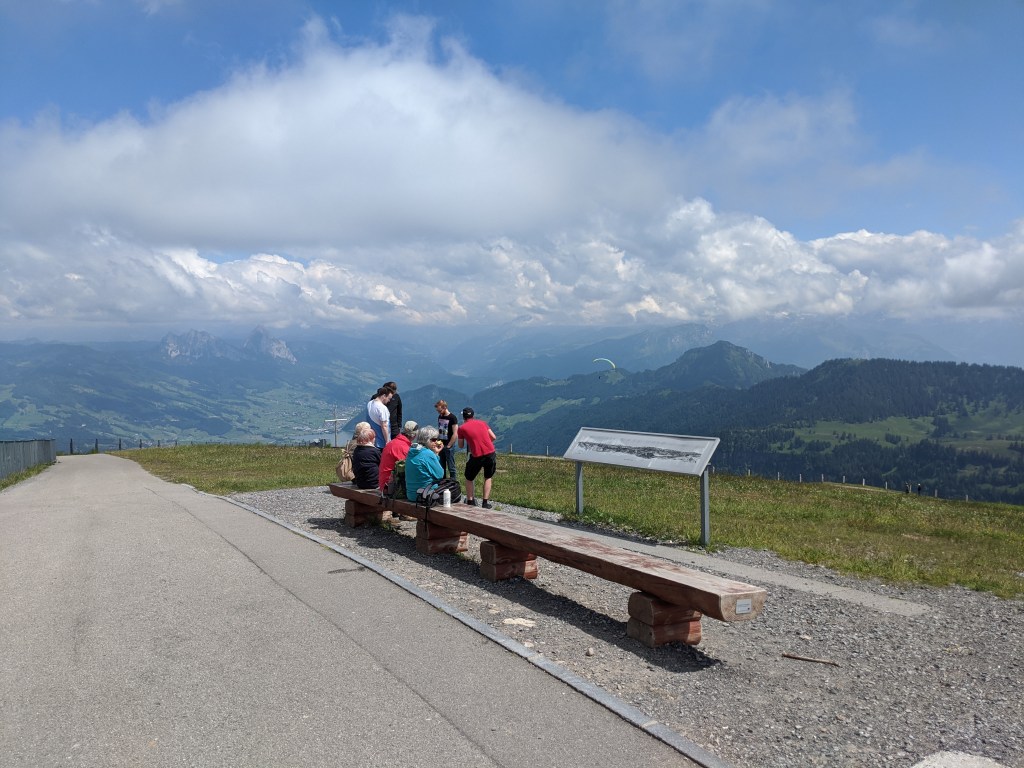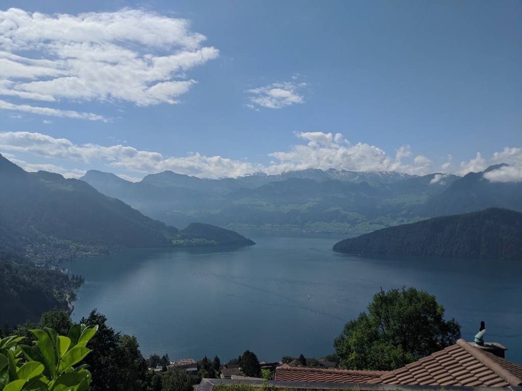 A kilátás a hegytetőről nagyon szép volt, az alpok szélénél álltunk, korülöttünk az egyik oldalon hófödte hegycsúcsok, a másikon pedig a luzerni, zugi, zürichi és még 4 másik, összesen 7 tó volt látható. Persze a lényeg, hogy ha lett volna egy nagyon messze látó messzelátónk, akkor látszott volna a ház, ahol lakom.